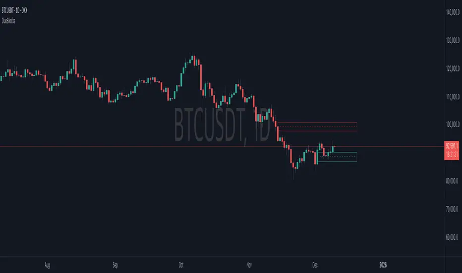 DuoBlocks detects bullish and bearish Order Blocks that form immediately under/over a valid Fair Value Gap. Each zone inherits its height from ATR, so the OB reflects realistic volatility instead of fixed candlestick based values. This makes the zones more adaptive, cleaner, and more faithful to ICT(Inner Circle Trader)-style OB identification.