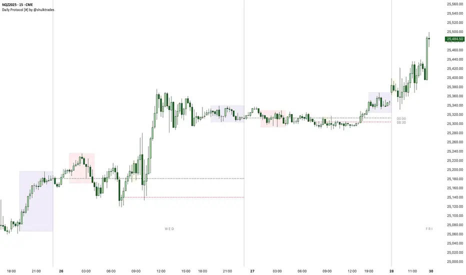 The Daily Protocol indicator is a comprehensive trading tool designed to help traders identify and visualize key intraday time-based levels and sessions for forex and other markets. This indicator automatically marks important market opening times, session ranges, and standard deviation projections to assist in technical analysis and trade planning.