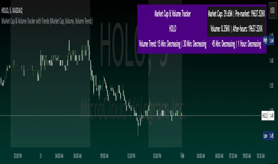 This indicator provides a compact, at-a-glance view of key market data directly on your chart, specifically focusing on Market Cap, Volume, and Volume Trends over various time intervals. It helps traders and investors monitor price action and volume shifts in real-time.
