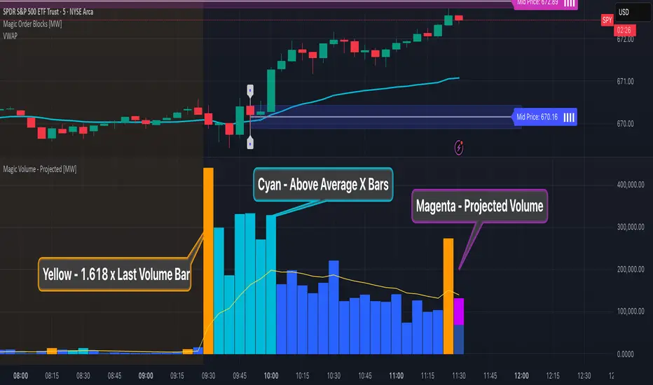 - Projected volume depends on intrabar pace; abrupt pauses/flushes can change the projection quickly, especially on very small timeframes.