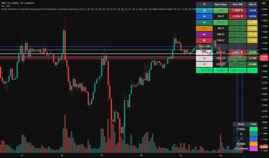 This indicator is designed to assist traders in monitoring multiple timeframe candle closes and identifying areas where price midpoints (50% levels) from different timeframes cluster together.