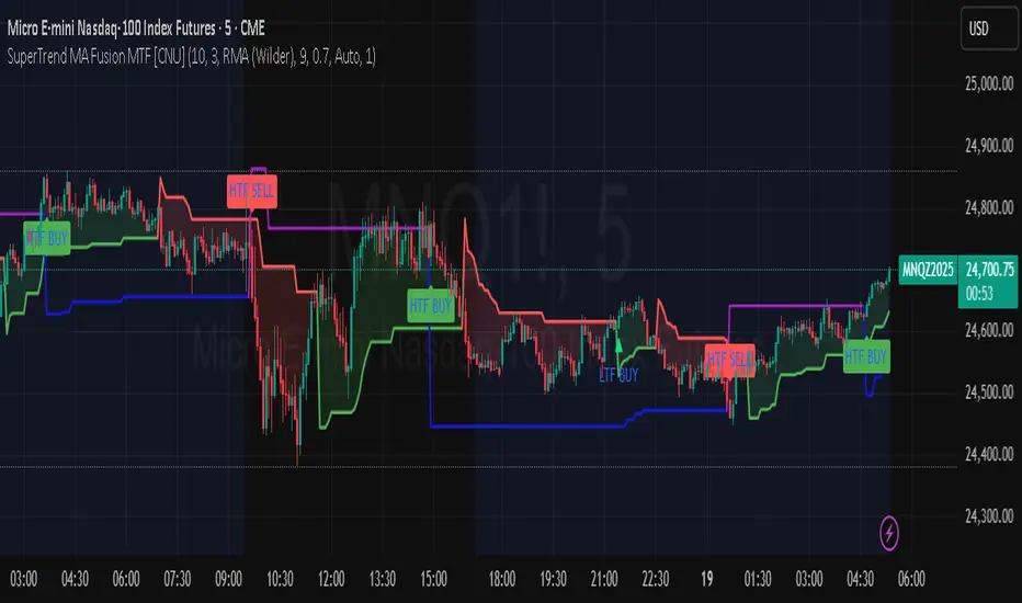 SuperTrend MA Fusion MTF [CNU] is a non-repainting, multi–timeframe SuperTrend that combines ATR with flexible MA smoothing to create a smoother and more adaptive trend line.