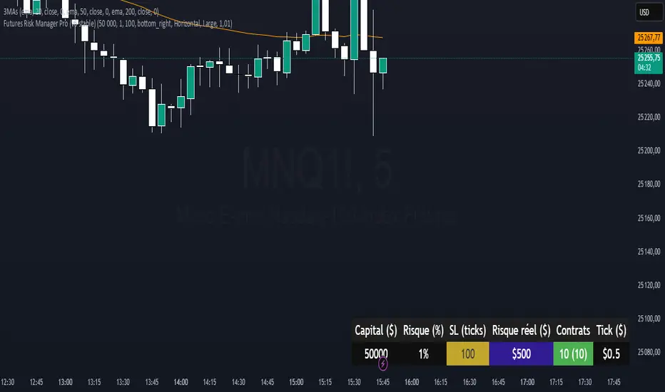 You must first enter your capital and your risk percentage. Then, when you specify your stop-loss size in ticks, the indicator will immediately tell you the number of contracts to use to stay within your risk percentage.
