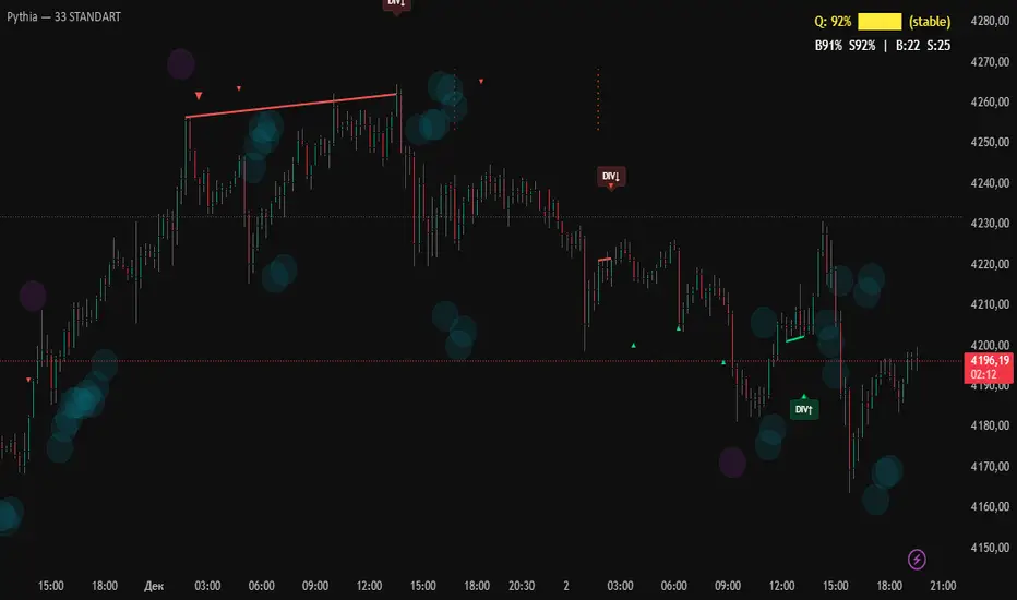 Pythia Standard is built on the same structural core as the Full Edition and focuses on practical trading tasks: timely detection of divergences, slowdown zones, traps, and local flow transitions.