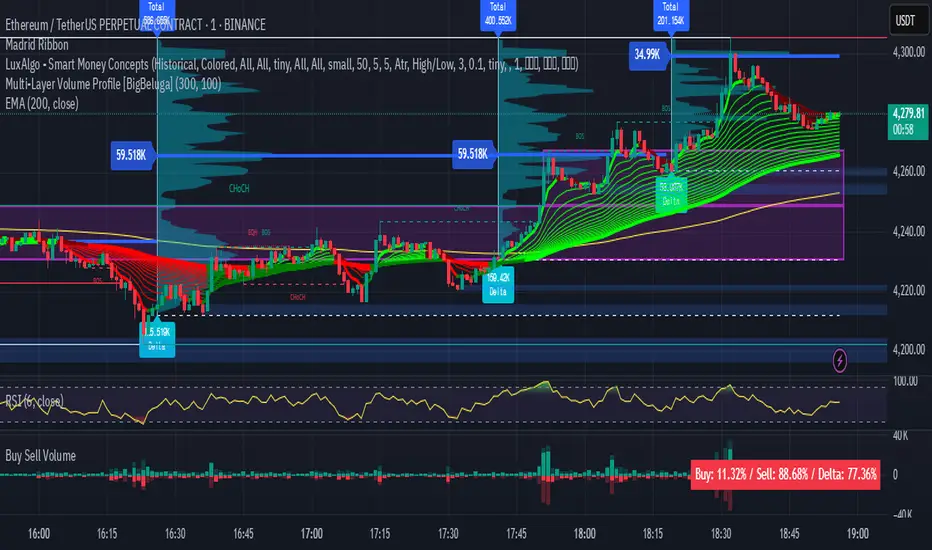 📄 Script DescriptionThis indicator visualizes buying and selling volume, calculates their ratios, and highlights the relative dominance (Delta %) of one side over the other.