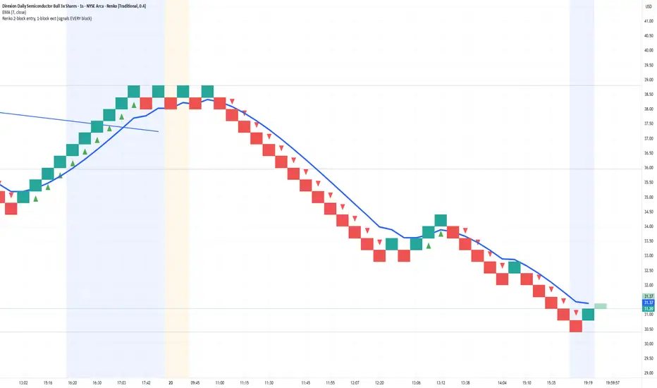Renko 2-block entry, 1-block exit (signals EVERY block)