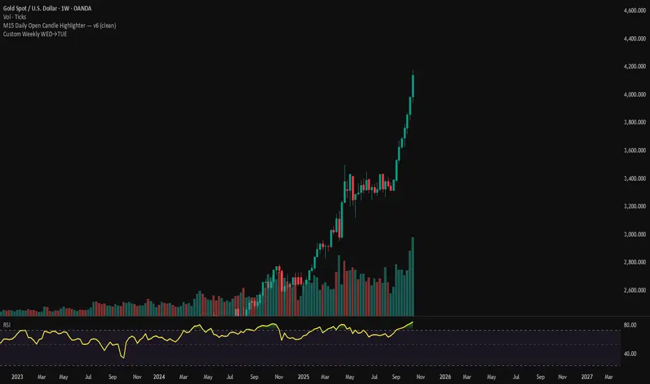 This indicator creates custom weekly candles with a week boundary running from Wednesday to Tuesday (WED→TUE) for any symbol. It is designed for systems that prefer to close the trading week on Tuesday’s session instead of the standard weekend.