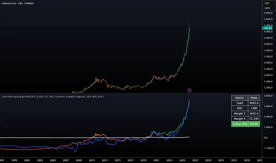 This indicator measures the structural profitability of gold mining by comparing the gold price with estimated production costs. It is designed as a macro-context tool, not a short-term trading signal.