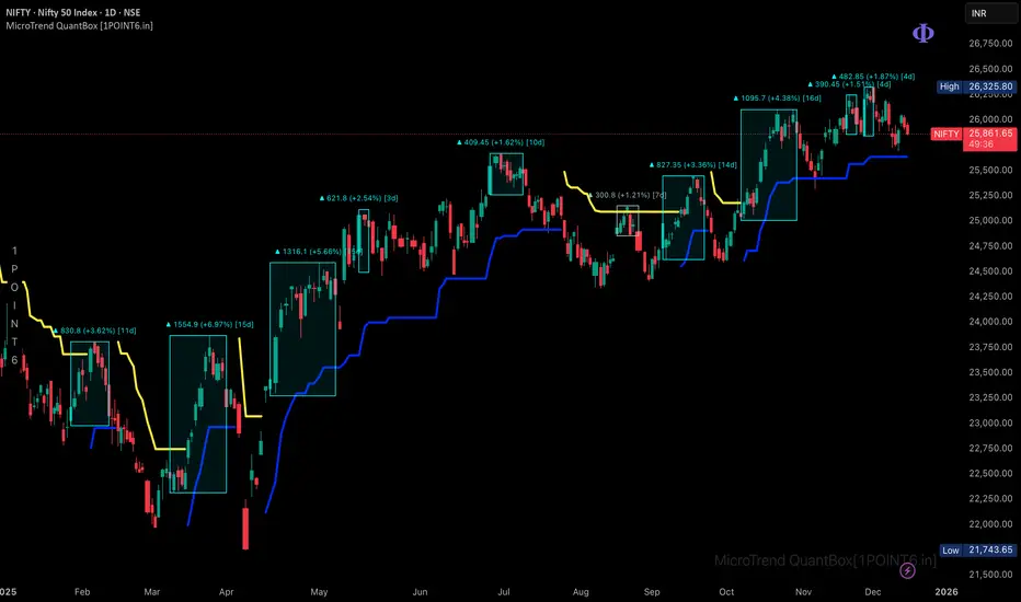 🚀 MicroTrend QuantBox [1POINT6.in] is a professional-grade market structure and momentum visualisation tool designed to help traders identify high-probability micro trends within larger market regimes — with built-in risk awareness.
