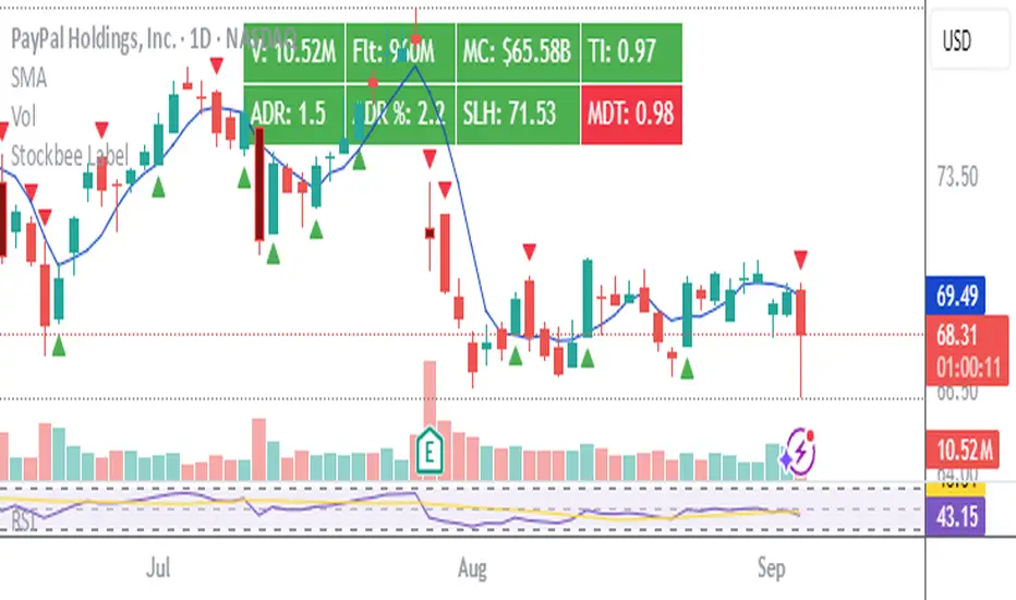 Unlock the full potential of your TradingView charts with this powerful indicator designed specifically for Stockbee methods. Instantly gain key market insights at a glance with a sleek, easy-to-read label displayed on your chart. This dynamic label provides critical data including Volume, Total Float, Market Capitalization, Trend Intensity, Average Daily Range (ADR), Half-Day Stop Loss level, and Modified Double Trouble (MDT).