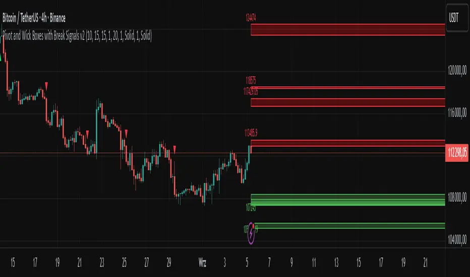 The "Pivot and Wick Boxes with Break Signals v2" is an advanced Pine Script® technical analysis tool that identifies pivot points (highs and lows) on the chart and draws customizable boxes based on the wicks of pivot candles. It is ideal for traders using price action strategies, helping to identify key support and resistance levels and potential breakout trading opportunities. With flexible settings, a volume filter, and label grouping, the indicator ensures clarity and precision on the chart.