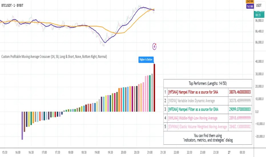 The script evaluates 61 moving average crossover systems across a customizable date range, allowing you to focus on specific historical windows for optimization or validation. It calculates each crossover's net profit performance and automatically ranks all results, displaying the top 5 performers in a summary table. Results are visualized through a color-coded column chart, making it easy to identify which crossover types have historically delivered the strongest outcomes.