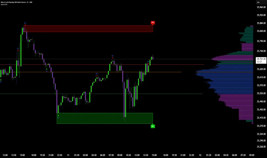 This indicator is a right-aligned fixed-range Volume Profile + SMT-style tools: