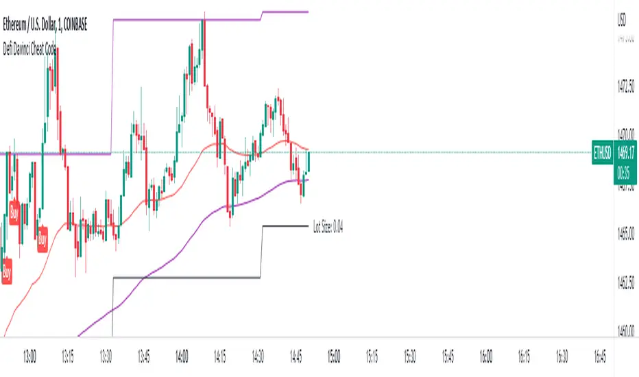 DeFi DaVinci cheat code is an indicator to help you identify buys and sells in the market. This indicator uses Moving averages and support and resistance zones to call to let you know when to Buy or Sell