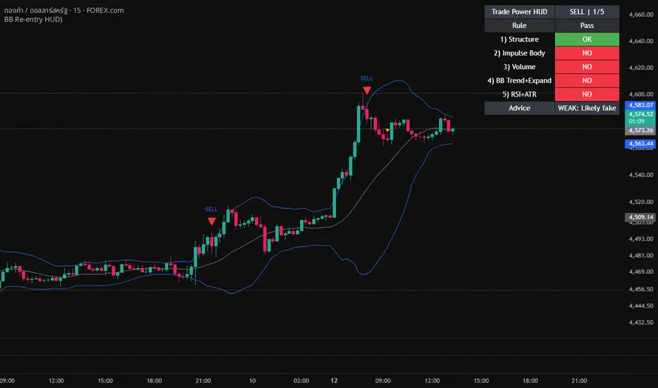 Re-enters back inside BB within 1–2 bars