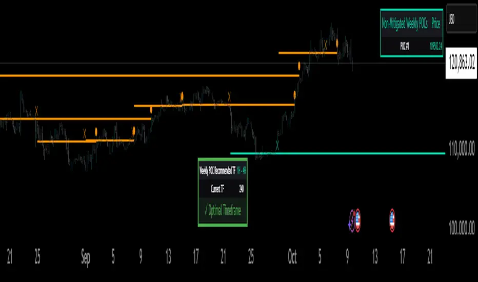 "●" Dot (Mitigation Point): Appears when price retests a POC level (High ≥ POC ≥ Low, or close within 10% of bar range). Virgin POCs (VPCs)—POCs not yet revisited—are even stronger price attractors than regular POCs, acting like gravitational pull that increases as price approaches.