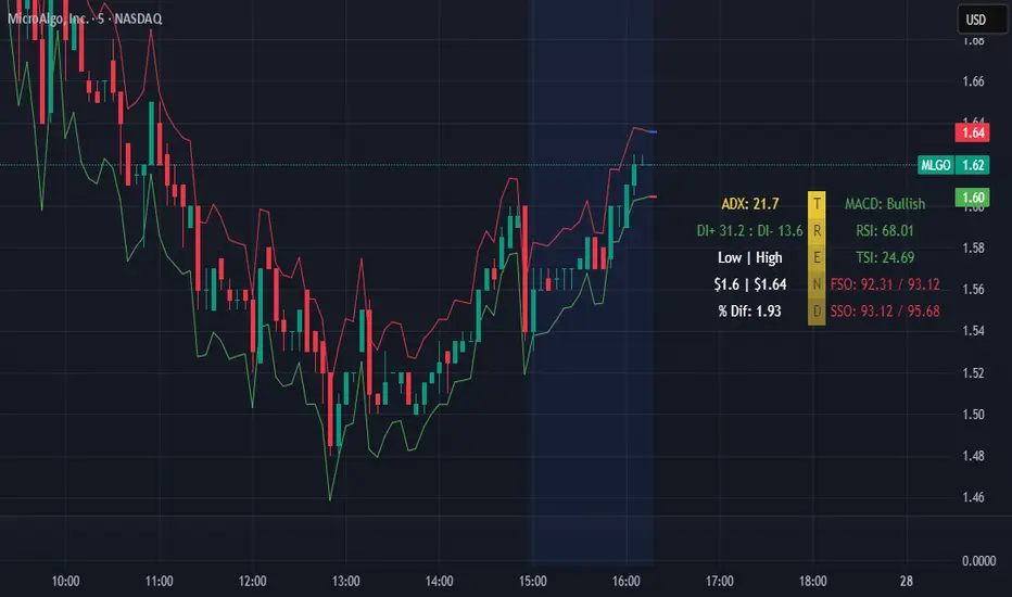 Uses ATR14, TSI, RSI, Fast Stochastic and Slow Stochastic information to determine potential high and low price, trend strength and direction. The information ia easy to read, self-descriptive and color coded for quick reference. Since it incorporates 5 different elements it could be used by itself but as with any indicator it's highly recommended to use it with other tried and true indicators.