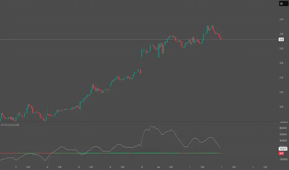 OFC – LITE v6 blends two high-signal components into a single 0–100 panel to help traders interpret momentum strength and liquidity flow at a glance.