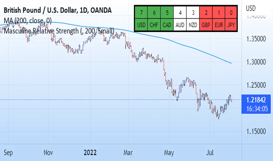 This relative strength indicator compares the G8 currencies against each other in all 28 combinations. It uses the 200 period moving average as a scoring system. For example on eurusd if current price action is above the MA that is +1 for the eur and -1 for the dollar and the inverse is applied if current price is under the 200 ma. The higher the number the stronger the currency. The weaker the number the weaker the currency. Pair the strongest currency with the weakest. This indicator does not guarentee profits and past performance does not guarentee the same future results.