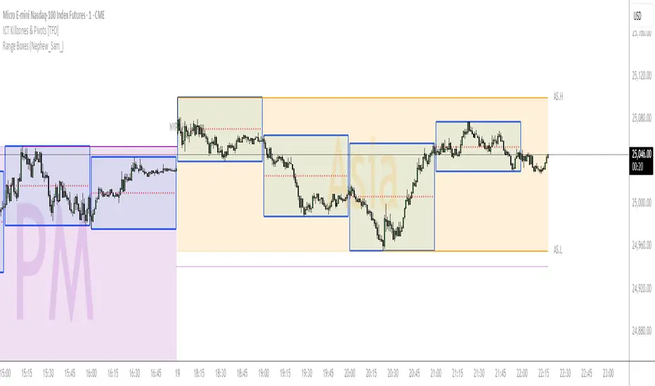 This indicator is just Nephew_Sam's "Range Box" indicator modified. It gives the user the opportunity to plot multiple range boxes. This has been one of my favorite indicators for a while. Hopefully some you you all can benefit from it as I have. Thank you @Nephew_Sam.