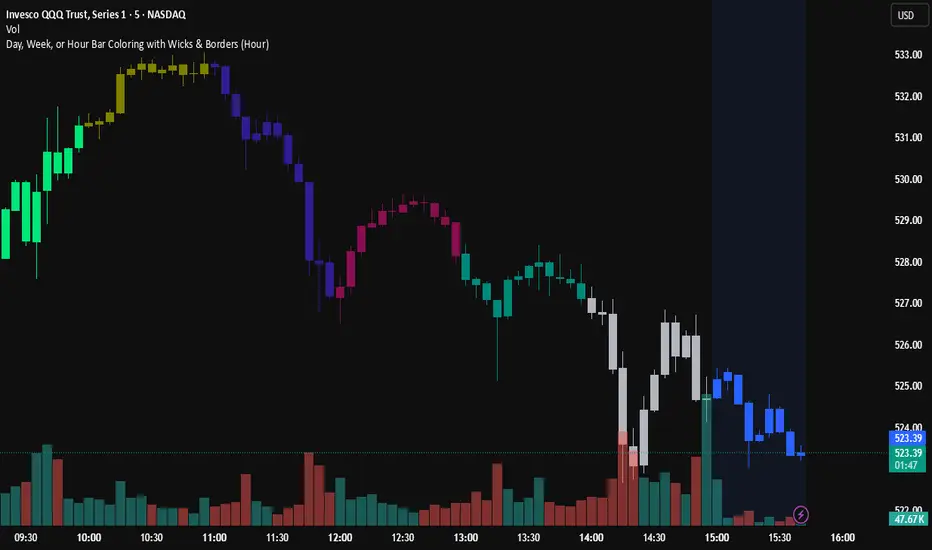 This is a simple Script that dynamically colors the chart bars based on the day of the week, week of the month, or hour of the day. Users can toggle between these three modes using the Color Mode input, allowing for flexible visual representation of time periods directly on the chart.