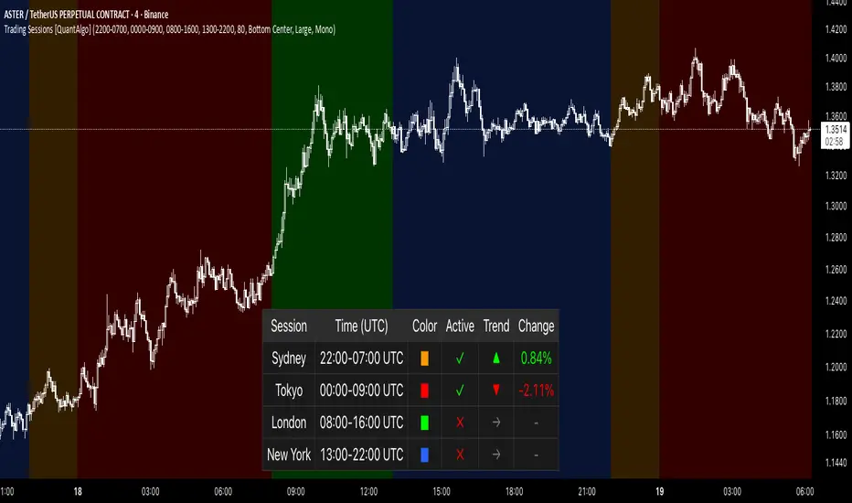 The Trading Sessions indicator tracks and displays the four major global trading sessions: Sydney, Tokyo, London, and New York. It provides session-based background highlighting, real-time price change tracking from session open, and a data table with session status. The script works across all markets (forex, equities, commodities, crypto) and helps traders identify when specific geographic markets are active, which directly correlates with changes in liquidity and volatility patterns. Default session times are set to major financial center hours in UTC but are fully adjustable to match your trading methodology.