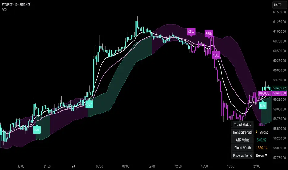 The **Uptrick: ACO** features a dynamic "cloud" that serves as a key element in its analysis. This cloud is constructed using a moving average combined with the Average True Range (ATR), which adjusts based on the market’s volatility. The cloud provides dynamic support and resistance levels, essential for identifying potential reversal zones or confirming trend continuations.