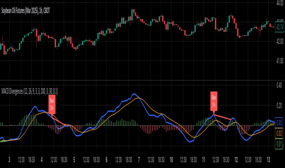 A sophisticated yet user-friendly tool designed to identify both bullish and bearish divergences using the MACD (Moving Average Convergence Divergence) indicator. This advanced script helps traders spot potential trend reversals by detecting hidden momentum shifts in the market, offering a comprehensive solution for divergence trading.