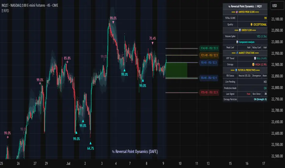Where other tools provide a static signal, RPD delivers a dynamic probability. It understands that a true market turning point is not a single event, but a cascade of failing momentum, structural breakdown, and a shift in market order. RPD's core engine meticulously analyzes each of these dynamic components—the market's underlying state, its velocity and acceleration, its degree of chaos (entropy), and its structural framework. These forces are synthesized into a single, unified Probability Score, offering you an unprecedented, transparent view into the conviction behind every potential reversal.
