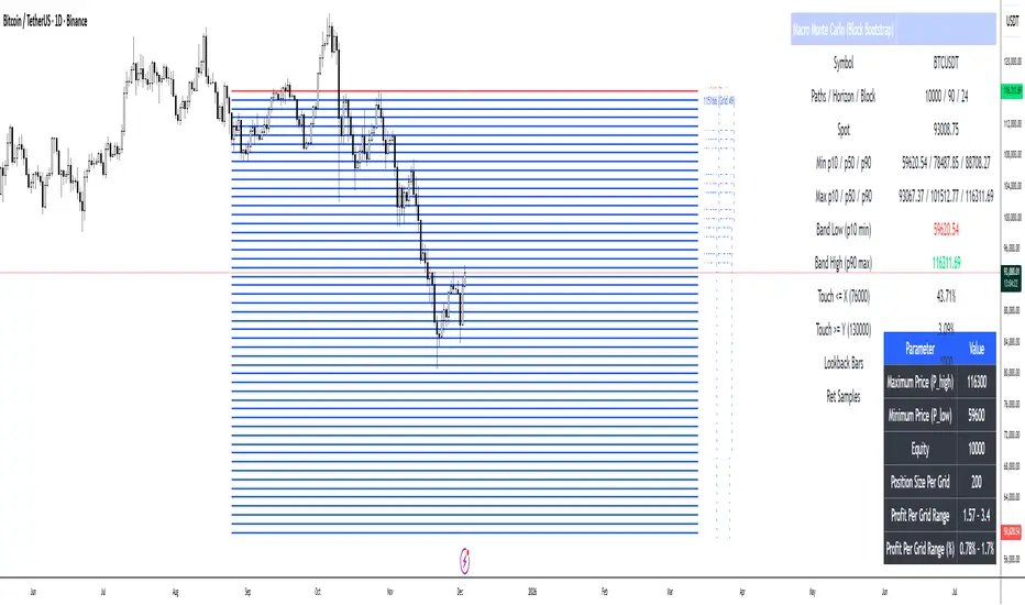The Macro Monte Carlo 10000 Prob with Bootstrap indicator is designed to view future price evolution through a probabilistic and statistically grounded lens. Instead of predicting a single deterministic outcome, it generates thousands of simulated future price paths (Monte Carlo Paths) to estimate the range of possible outcomes. By analyzing the lowest and highest values reached within each simulated path, the indicator provides a macro-level understanding of how far price could realistically decline or rally within a specified forecast horizon. This approach shifts the focus from price forecasting to probability distribution estimation, enabling more robust decision-making for systematic traders, risk managers, and options strategists.