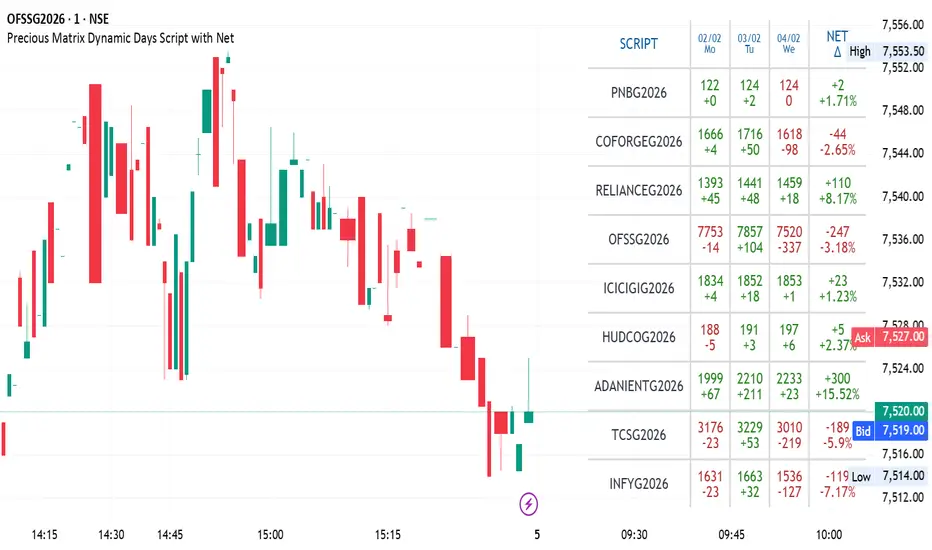 Precious Matrix – Dynamic Days with Net is a multi-symbol dashboard indicator for TradingView that shows recent daily closes, day-to-day change, and net performance for up to 9 scripts in one clean, compact table.
