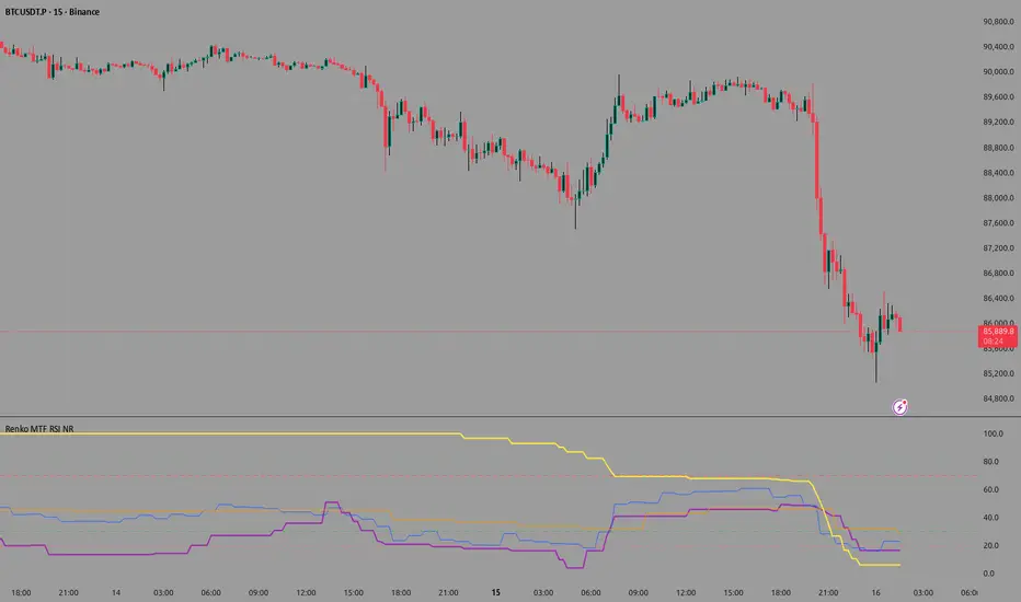 This is a Renko-based Multi-Timeframe RSI indicator with Inverted Volatility Oscillator that combines three technical analysis concepts to provide trading signals without repainting issues.