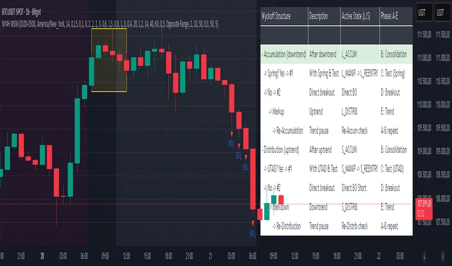 NY 4H Wyckoff State Machine — Full (Re-Entry, Breakout, Wick, Re-Accum/Distrib, Dynamic Table) — One-Candle Wyckoff Re-Entry (OCWR)