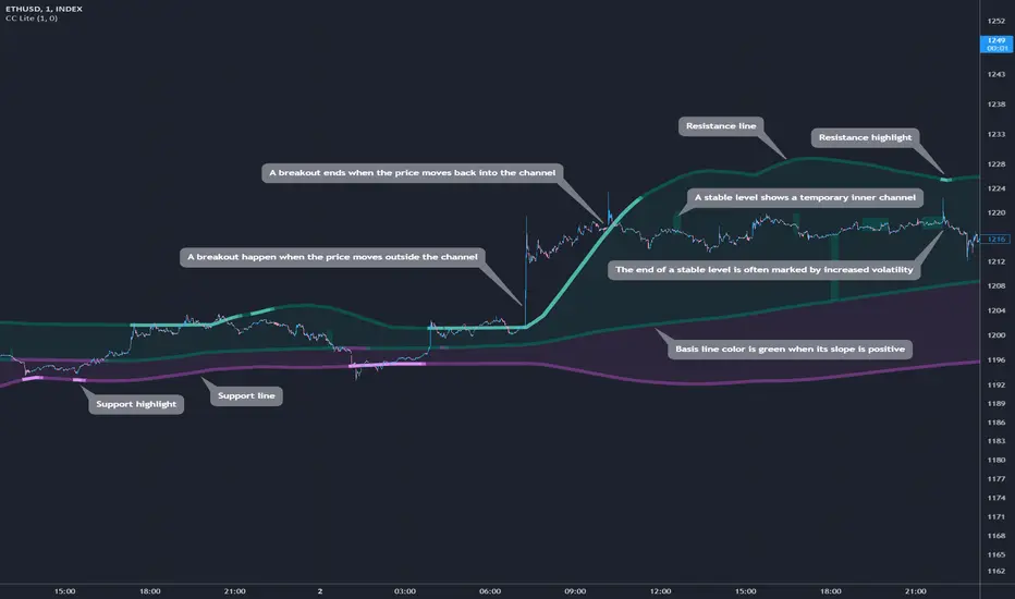 Cosmic Channel Lite draws a dynamic channel consisting of a support line, basis line and resistance line. These are calculated by applying the Reduced Median Method to groups of moving averages of different type over several periods each, effectively taking 20 data points and reducing them to 3. In between, 6 internal levels are left to give context inside the channel with stable levels, the extremes of which help highlight the SR lines (see chart). The basis line color is determined by its smoothed angle with positive angles in green and negative in purple. The aim of this indicator is to provide a consistent and generic price context that works out-of-the-box and accordingly the settings have been stripped to the bare minimum with no need to continually adjust them.