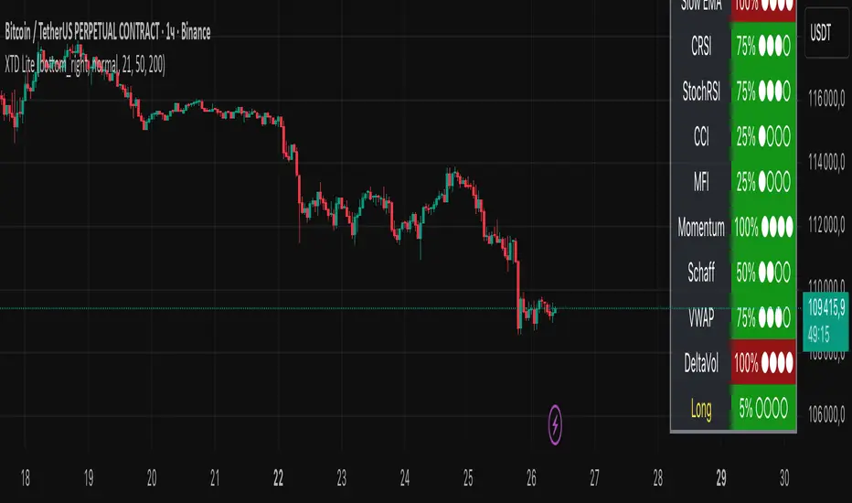 The X Trend Dashboard provides an instant snapshot of market sentiment by analyzing the aggregate "pressure" from 11 classic technical indicators. This version features a flexible EMA Fan (Fast, Medium, and Slow EMAs) instead of fixed timeframes, allowing for greater adaptability to any chart.