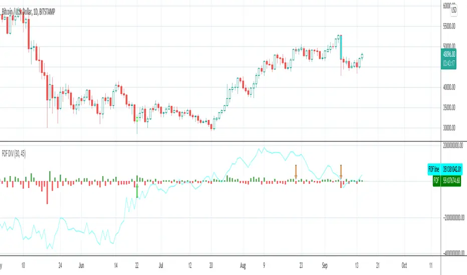 A bullish divergence occurs when the price hit a lower low and the FOF line is in uptrend. A down arrow will be drawn above the current FOF line when there is a bearish divergence between FOF and price trend.