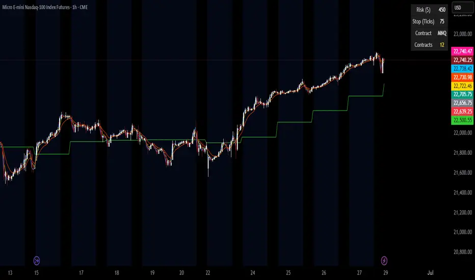 Synopsis: The Micro Futures Contract Calculator is a sleek, minimalist indicator that calculates the number of Micro E-mini Nasdaq-100 (MNQ) or S&P 500 (MES) contracts you can trade based on a fixed dollar risk and stop-loss (in ticks). Displayed in a compact, professional table in the top-right corner, it shows your risk, stop-loss, contract type, and calculated contracts, helping traders maintain consistent risk management.