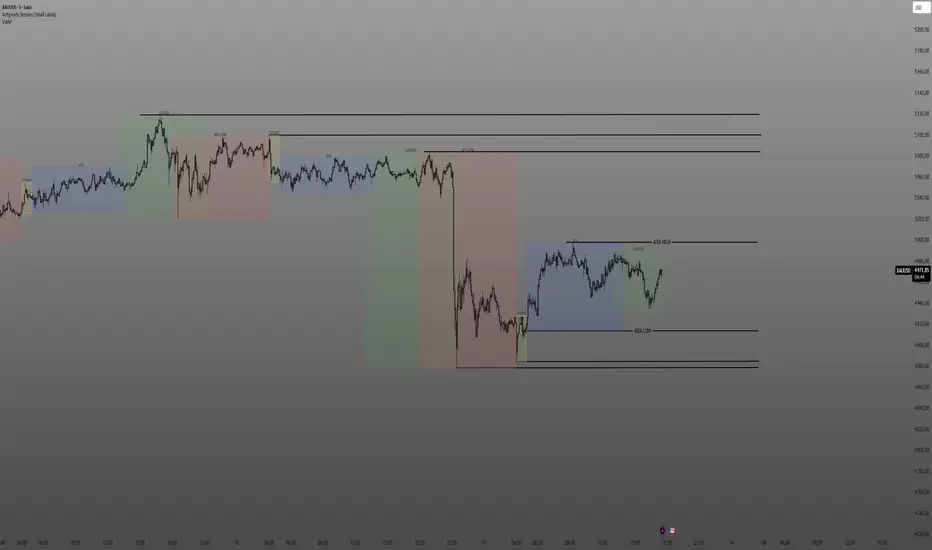📦 **Session Boxes** — Each session is drawn as a transparent box spanning the session's high-to-low range. The box updates in real time as new highs and lows are printed.