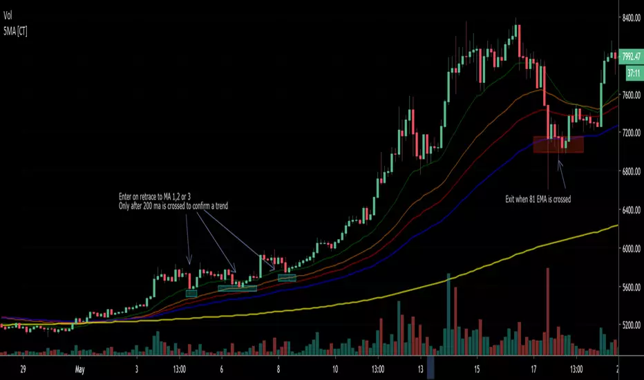 Defaults to 1 SMA with 4 EMA bands. 200 SMA is intended to show the trend; 20,40 and 55 EMA show entries; 81 EMA is used as stop/take profit. Defaults are inspired by 'Eric Choe' but you can switch between EMA and SMA as per your own preference. Philakone uses all 5 as EMA 8, 13, 21, 55, 200