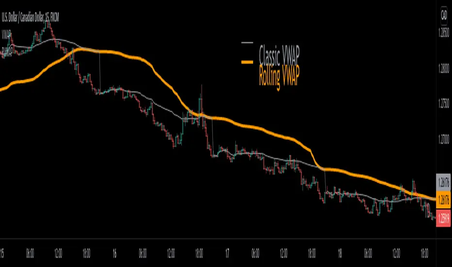 This indicator displays a Rolling Volume-Weighted Average Price. Contrary to VWAP indicators which reset at the beginning of a new time segment, RVWAP calculates using a moving window defined by a time period (not a simple number of bars), so it never resets.
