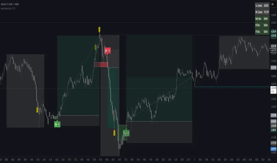 Aurora Reversal Suite is an all-in-one institutional trading toolkit designed to identify high-probability reversal setups. By combining Liquidity Sweeps, Inversion Fair Value Gaps (iFVG), and Multi-Timeframe Bias, this indicator removes the noise and highlights exactly where price is likely to turn.