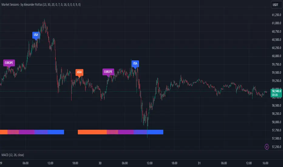 This TradingView indicator displays market sessions for USA, EUROPE, and ASIA on your chart. It provides a clear and intuitive way to identify the active market periods, making it easier to plan your trades.