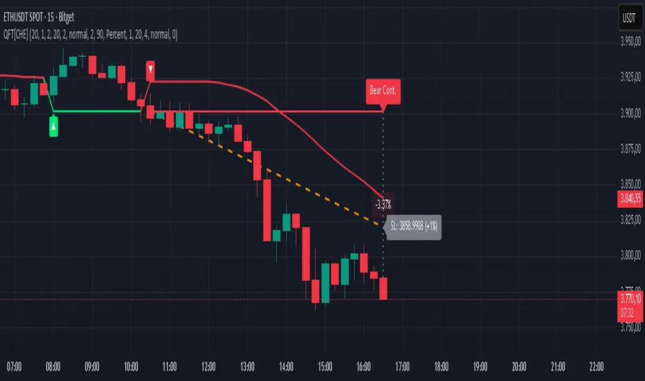 The Quantum Fluxtrend [CHE] builds on traditional Supertrend logic by incorporating a midline derived from smoothed high and low values, creating adaptive bands that respond to market range expansion or contraction. This results in fewer erratic signals during volatile periods and smoother tracking in steady trends, while an overlaid event system highlights breakout confirmations, potential traps, or continuations with visual lines, labels, and percentage deltas from the close. Users benefit from real-time VWAP calculations anchored to events, providing dynamic stop-loss suggestions to help manage exits without manual adjustments. Overall, it layers signal robustness with actionable annotations, reducing noise in fast-moving charts.