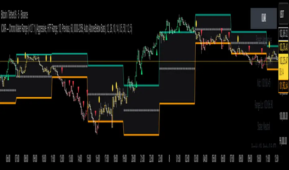 ICMR — Chrono Maker Range is a hybrid market-structure tool designed to help traders clearly identify directional bias and high-quality breakouts using either Higher-Timeframe (HTF) ranges or Initial Balance (IB) ranges. The indicator automatically builds the range, colors candles by market state, and highlights breakout signals using smart filters to reduce noise.