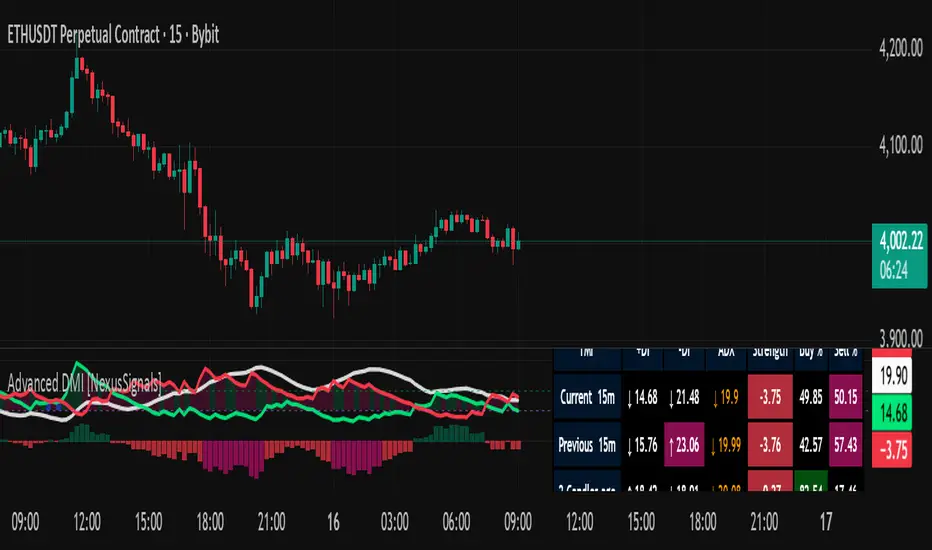 The Advanced DMI [NexusSignals] is a enhanced version of the classic Directional Movement Index (DMI) and Average Directional Index (ADX) indicator, designed to provide traders with deeper insights into trend strength, direction, and momentum. It combines visual plots, a customizable data table, and multiple alert conditions to help identify bullish/bearish trends, consolidations, and potential reversals. This indicator is ideal for trend-following strategies, scalping, or swing trading across various timeframes and assets.