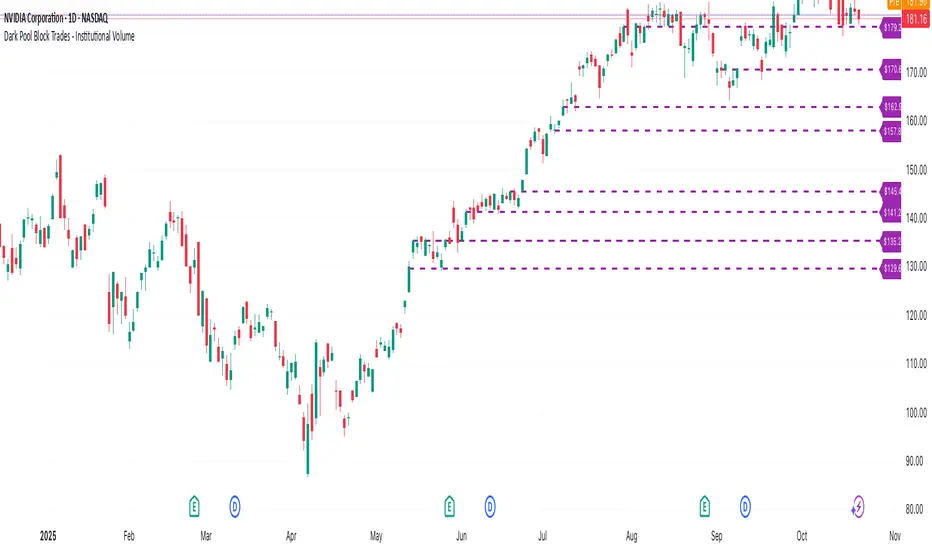 This Pine Script displays institutional dark pool transactions as visual markers on your charts. The script comes with sample data for immediate use. For expanded ticker coverage and real-time updates, external data services are available.