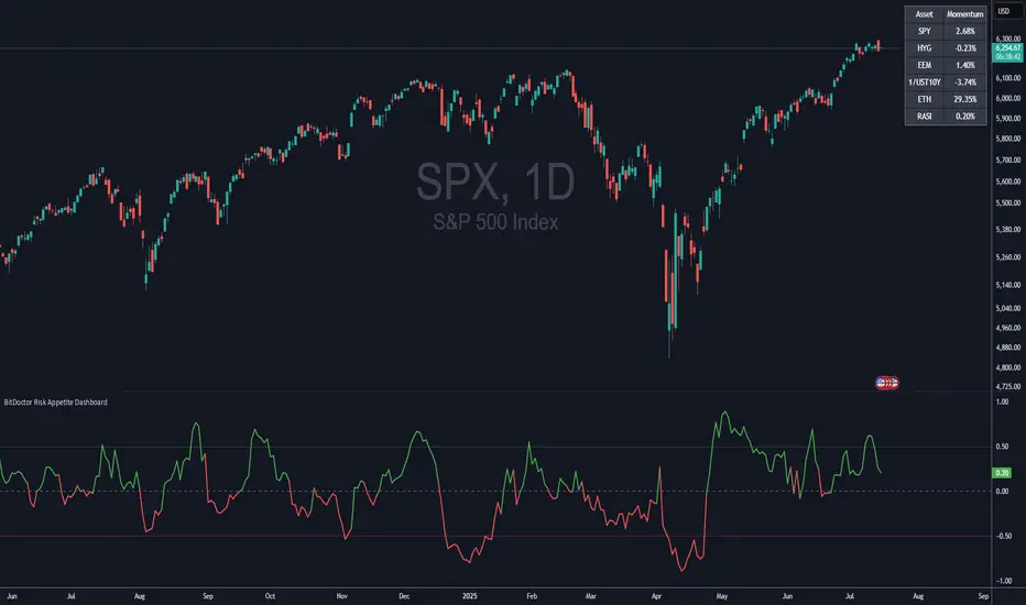 - Normalizes each signal and plots a composite Risk Appetite Strength Index (RASI) on the chart.