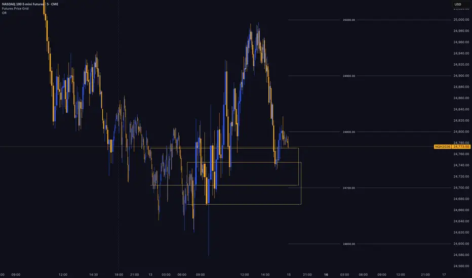 Futures Price Grid is a simple visual aid built specifically for futures traders who want an instant sense of distance and scale. It includes two independent grids so you can run ES and NQ in one indicator: set a starting price for each product, choose your spacing (increment), and the script plots clean, evenly spaced horizontal levels above and below. Optional right-side labels keep the chart readable while making it obvious how far price has moved from your reference levels.