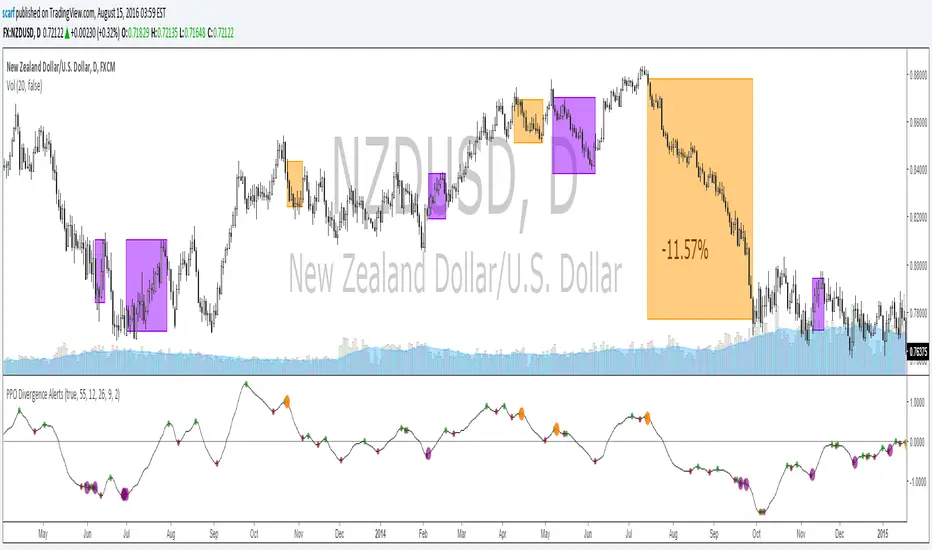 This is a pretty straightforward script that adds alerts to Pekipek's excellent PPO Divergence indicator and changes the visuals a bit. You can have the alerts fire on these events: