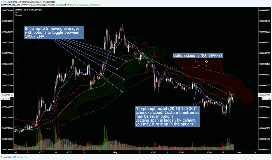This script has the option for showing up to 5 moving averages with options to toggle between SMA / EMA. Also includes crypto optimized Ichimoku cloud.